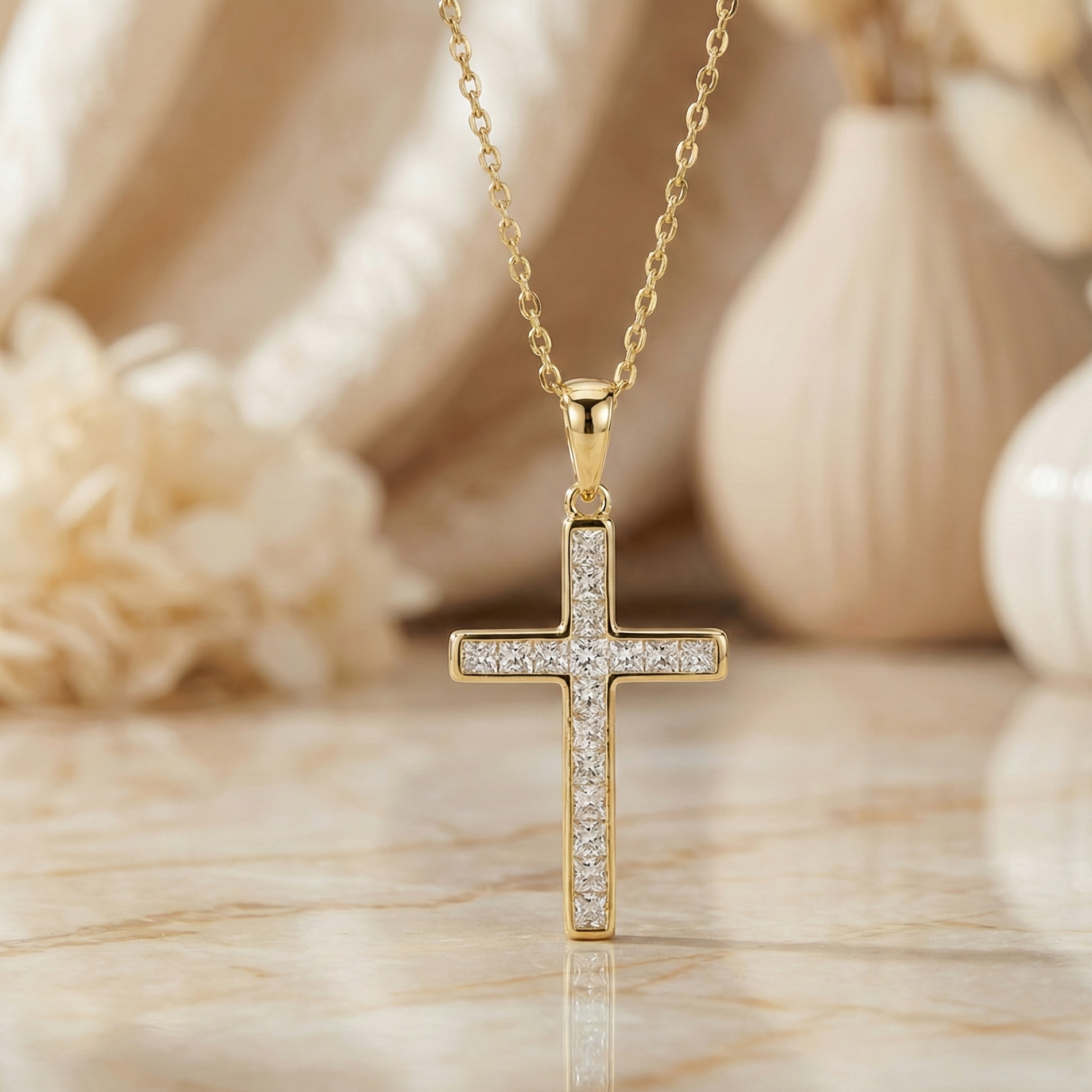 Celebrate faith with refined beauty through this Moissanite Cross Necklace, designed with a minimalist silhouette and radiant brilliance. Featuring princess-cut moissanite stones set in a sleek gold cross pendant, this necklace blends timeless symbolism with contemporary elegance.