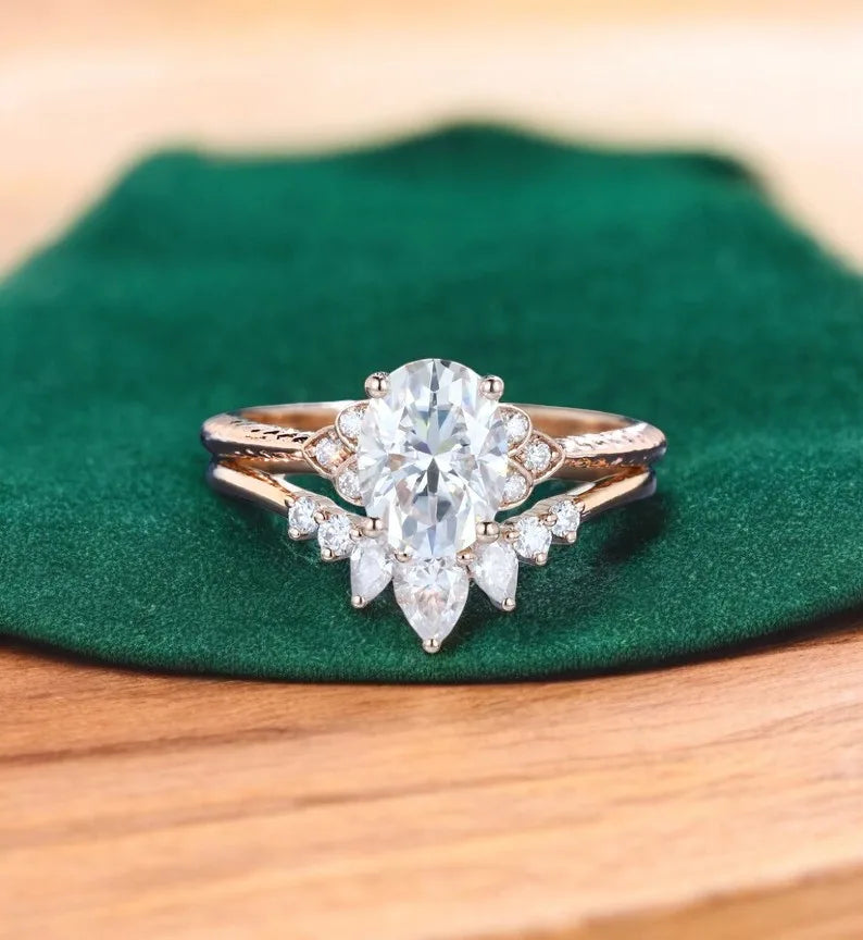 This Lab Grown Diamond Engagement Ring Set features a breathtaking oval cut center diamond framed with delicate side accents, paired with a matching contour wedding band adorned with pear and round cut diamonds. Handcrafted in 14K rose gold, this set is a perfect blend of timeless beauty and sustainable luxury.