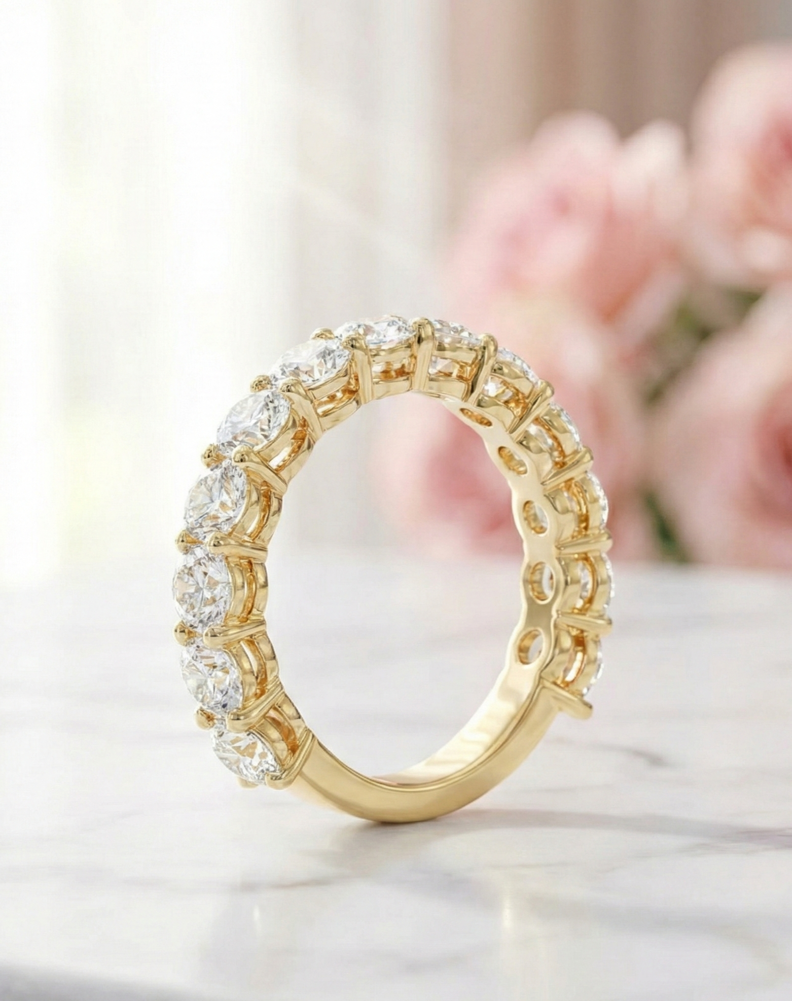 Designed for effortless stacking or stunning solo wear, this band pairs beautifully with engagement rings or makes a meaningful anniversary, promise, or bridal ring. The half-eternity setting offers brilliance across the top while ensuring all-day comfort.