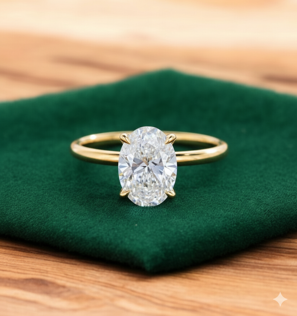 The centerpiece features a brilliant oval-cut lab grown diamond, known for its fire, sparkle, and eco-friendly origins. Its clean, solitaire design highlights the diamond’s brilliance, while the sleek yellow gold band ensures an elegant finish that will never go out of style.
