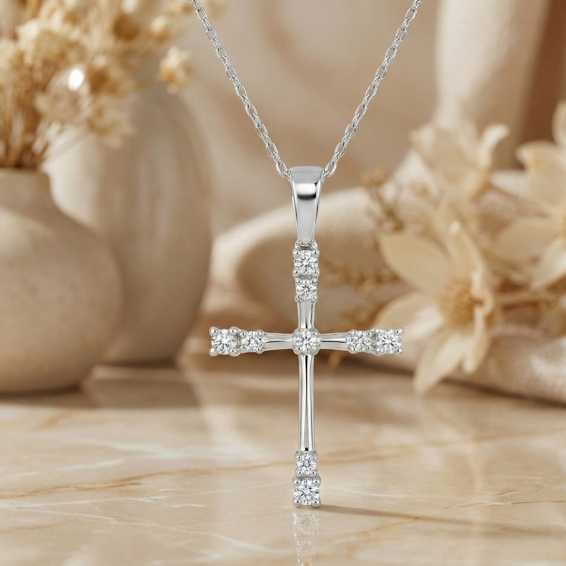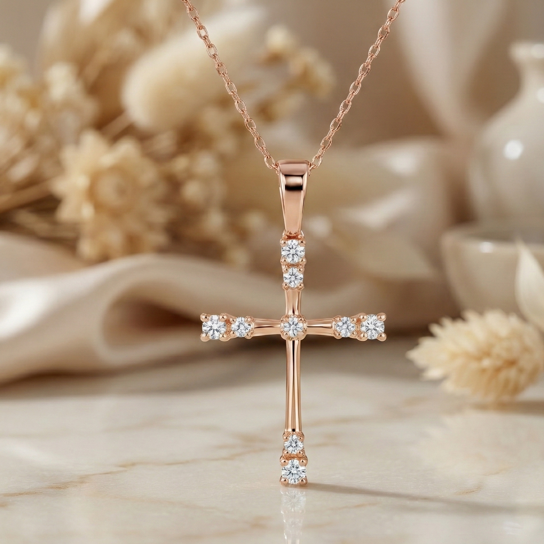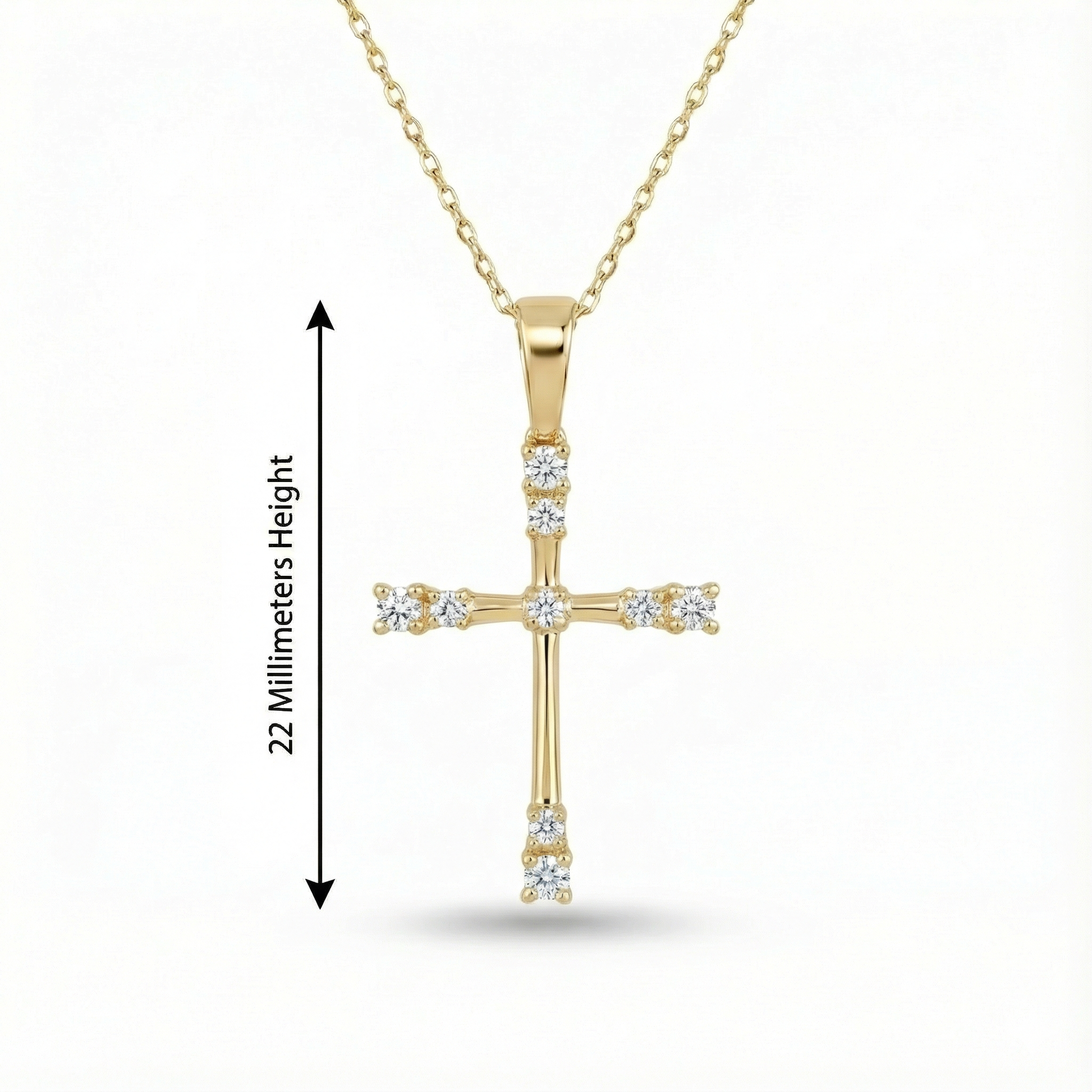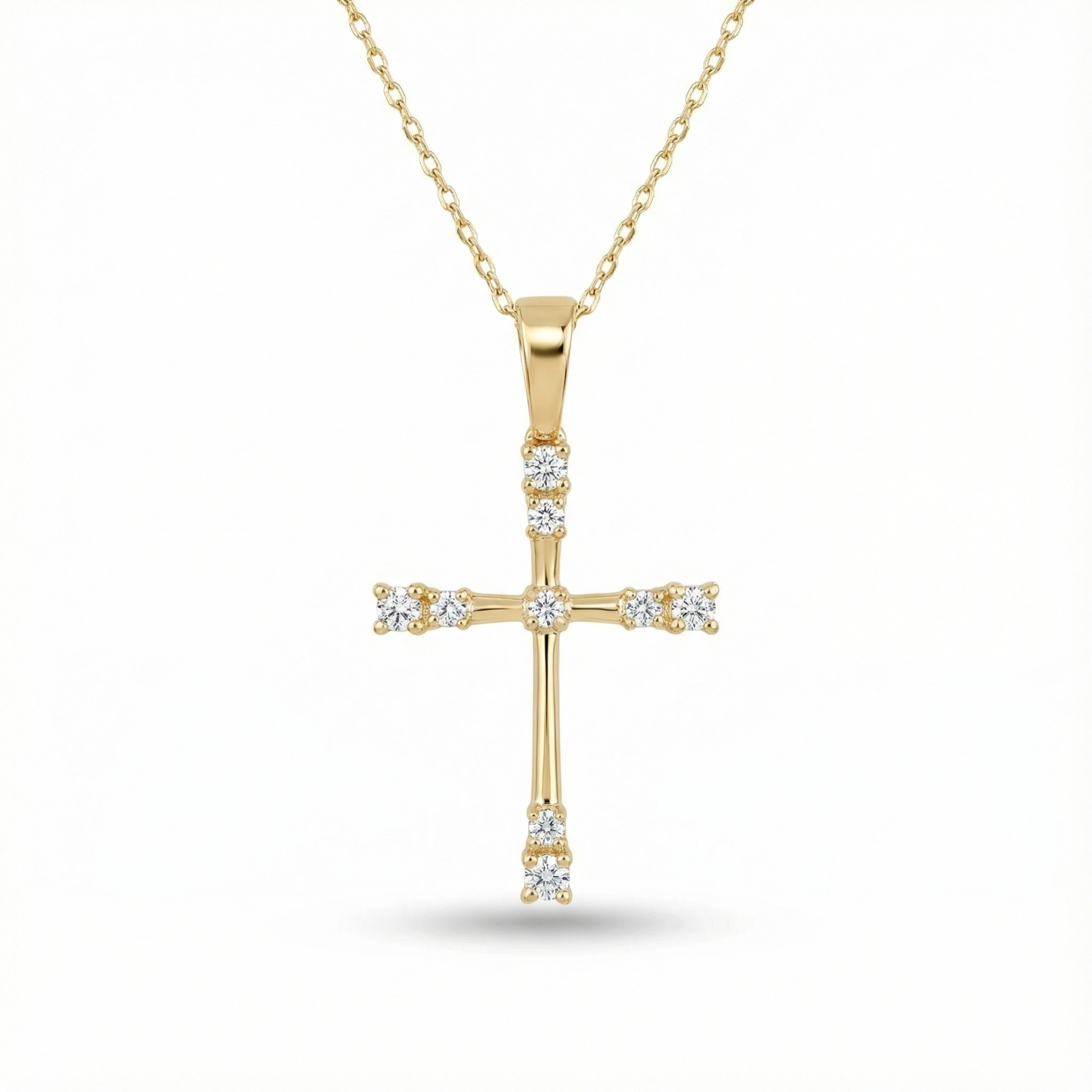 Crafted in solid gold and adorned with brilliant-cut moissanite stones, this cross pendant offers timeless sparkle while maintaining a delicate and refined appearance.
