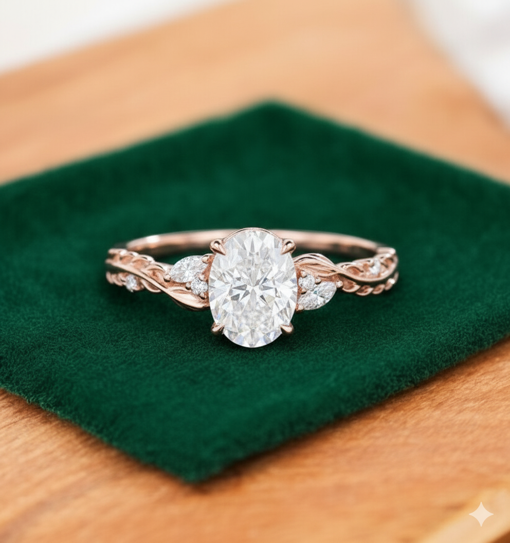 The oval cut diamond offers timeless elegance with a flattering, elongated sparkle, while the delicate leaf motif band symbolizes love, growth, and eternity. Designed with sustainability in mind, lab grown diamonds are ethical, eco-friendly, and conflict-free, offering the same brilliance and durability as mined diamonds.
