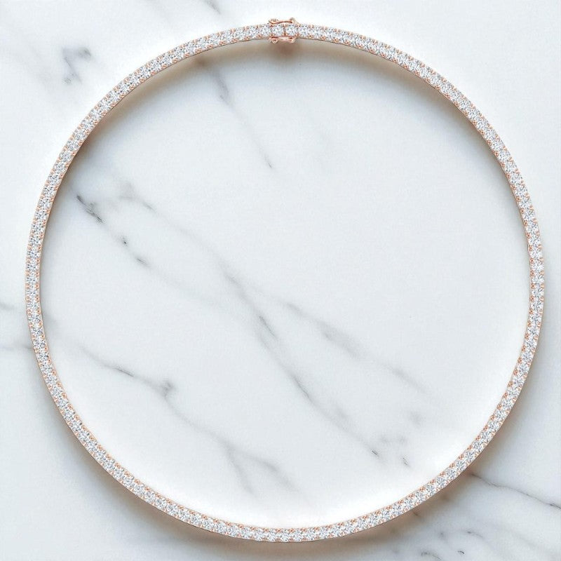 Elevate your elegance with this Rose Gold Four Prong Round Lab Grown Diamond Tennis Necklace, a timeless symbol of sophistication. Crafted in 14K or 18K rose gold, each brilliant round lab-grown diamond is securely set in a four-prong setting, creating a seamless line of sparkle that hugs your neckline beautifully.